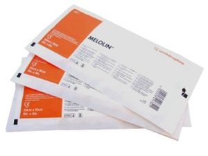 Melolin consists of a highly absorbent cotton and acrylic fibre pad which is heat bonded on one side to a very thin perforated polyester film. The film side of the dressing is placed next to the wound. Melolin consists of three layers 1 Non adherent perforated film 2 Highly absorbent cotton/acrylic pad 3 Hydrophobic backing layer