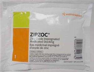 Zipzoc* is a sterile zinc oxide impregnated stocking. It is indicated for the treatment of chronic leg ulcers. Where chronic venous insufficiency exists, Zipzoc can be used as a primary contact layer under compression bandaging or hosiery. Zipzoc is a preservative free dressing thus reducing sensitivity reactions, and it contains white soft paraffin and liquid paraffin so it will not dry or adhere. - Stocking presentation means the product is easy to apply and remove with less mess therefore saving time.