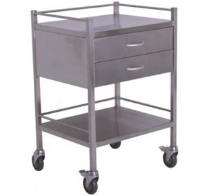 High quality, fully stainless steel trolley with double drawer. Guard rail